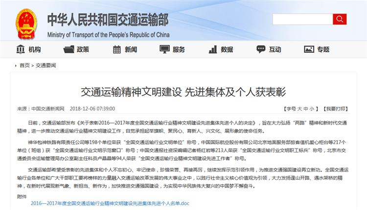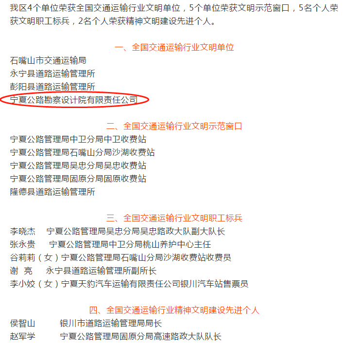 近日,交通運(yùn)輸部發(fā)布《關(guān)于表彰2016—2017年度全國(guó)交通運(yùn)輸行業(yè)精神文明建設(shè)先進(jìn)集體先進(jìn)個(gè)人的決定》(交政研發(fā)〔2018〕162號(hào)),對(duì)全國(guó)交通運(yùn)輸行業(yè)在思想道德建設(shè)和精神文明建設(shè)中成績(jī)突出的先進(jìn)集體和個(gè)人進(jìn)行表彰。寧夏公路勘察設(shè)計(jì)院有限責(zé)任公司榜上有名,被授予“全國(guó)交通運(yùn)輸行業(yè)文明單位”稱號(hào)。