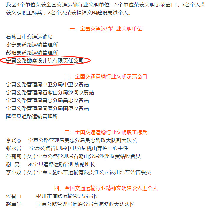 近日,交通運輸部發(fā)布《關于表彰2016—2017年度全國交通運輸行業(yè)精神文明建設先進集體先進個人的決定》(交政研發(fā)〔2018〕162號),對全國交通運輸行業(yè)在思想道德建設和精神文明建設中成績突出的先進集體和個人進行表彰。寧夏公路勘察設計院有限責任公司榜上有名,被授予“全國交通運輸行業(yè)文明單位”稱號。