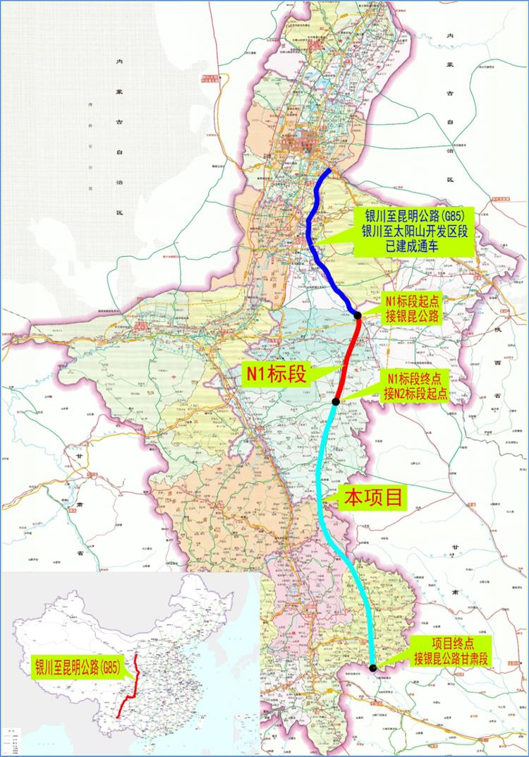 銀川至昆明公路(G85)起于寧夏銀川市,止于云南昆明市,全長2322km,是《國家高速公路網(wǎng)規(guī)劃》(2013-2030)南北縱向線中的一條,南北縱貫我國核心腹地,北接呼包銀榆、寧夏沿黃、陜甘寧經(jīng)濟區(qū),向南聯(lián)結(jié)關(guān)天、成渝經(jīng)濟區(qū)、滇中經(jīng)濟區(qū)和多個城市群,對我國西部內(nèi)陸地區(qū)經(jīng)濟社會發(fā)展的輻射帶動作用非常顯著。本次設(shè)計項目起點北接已建成通車的銀川至太陽山段,南接已開工建設(shè)的銀昆高速甘肅段,推薦方案路線全長236.781km,全線采用封閉式雙向四車道高速公路標準,設(shè)計速度100km/h,路基寬度為26m。中設(shè)設(shè)計集團寧夏院承擔N1標段設(shè)計任務(wù),路線全長55.867公里,設(shè)置大中橋9座、互通式立交3處。