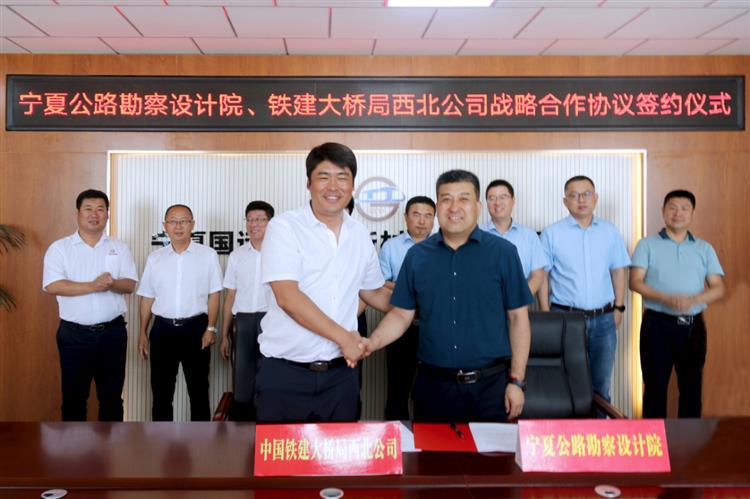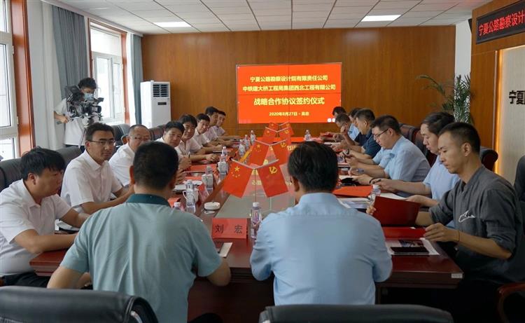 2020年8月27日上午,“寧夏公路勘察設(shè)計院工程技術(shù)實驗與研發(fā)基地”揭牌儀式及“寧夏公路勘察設(shè)計院與中鐵建大橋工程局集團(tuán)西北工程有限公司戰(zhàn)略合作協(xié)議簽約儀式”在寧夏國運鐵建高新材料科技有限公司(寧夏院工程技術(shù)實驗與研發(fā)基地所在地)順利舉行。總經(jīng)理趙旭東與中鐵建大橋工程局集團(tuán)西北公司總經(jīng)理赫宏偉代表雙方簽署了戰(zhàn)略框架協(xié)議。