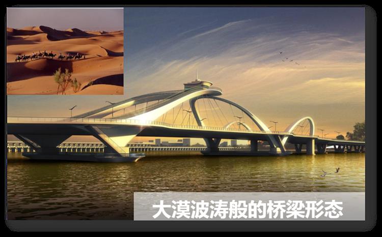 寧夏中衛(wèi)市被譽為“沙漠水城”,也有“塞上明珠”之稱,衛(wèi)民黃河大橋橋梁設(shè)計結(jié)合中衛(wèi)市獨特的景觀特點,橋梁形態(tài)猶如大漠的波濤,線條優(yōu)美自然。觀景平臺在造型上將美觀與文化融合,與中衛(wèi)市打造的沙漠水城融為一體,象征著中衛(wèi)這顆“沙漠之珠”在遼闊的邊塞大地上熠熠生輝,蓬勃發(fā)展。