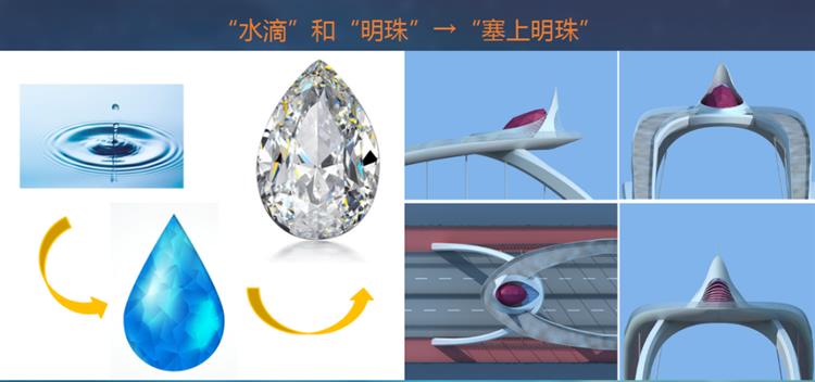 觀景平臺設(shè)計從“水滴”和”明珠“這兩個概念出發(fā),主體部分采用鉆石切面的造型,夜景效果猶如一顆璀璨的明珠鑲嵌于橋體之上;平臺附體部分以水滴的元素,無論是鳥瞰還是車行視角,都猶如抽象水滴的造型。平臺下部的橋拱如同蜿蜒的絲綢之路,托起這顆明珠,托起這座城市。登上觀景平臺,白天可以一睹大漠孤煙直、長河落日圓的優(yōu)美畫卷,到了晚上則可以觀賞到“浩瀚星空之天河、川流不息之車河、源遠流長之黃河”的美景。