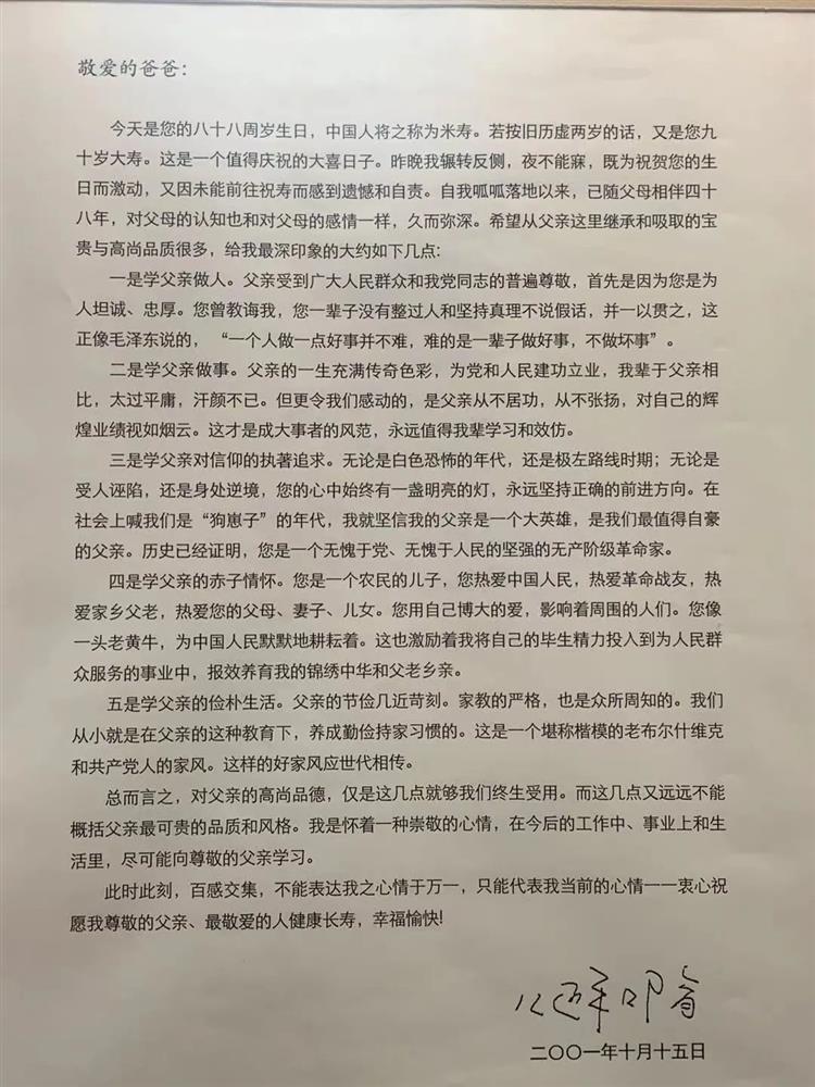 習(xí)近平寫給父親習(xí)仲勛的一封拜壽信