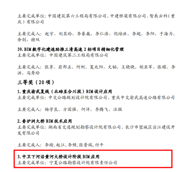 近日,2021年度中國公路學(xué)會“交通BIM工程創(chuàng)新獎(jiǎng)”評審結(jié)果公布,由寧夏公路勘察設(shè)計(jì)院有限責(zé)任公司完成的《中衛(wèi)下河沿黃河大橋設(shè)計(jì)階段BIM應(yīng)用》項(xiàng)目榮獲中國公路學(xué)會“交通BIM工程創(chuàng)新獎(jiǎng)”三等獎(jiǎng),同時(shí)這也是寧夏區(qū)內(nèi)交通BIM技術(shù)應(yīng)用獲得的第一個(gè)全國獎(jiǎng)項(xiàng)。