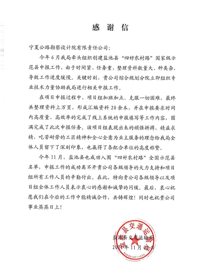 近日,鹽池縣交通運輸局向我院發(fā)來《感謝信》,并在信中對我院在本次申報工作中的全力支持和辛勤付出表示感謝。