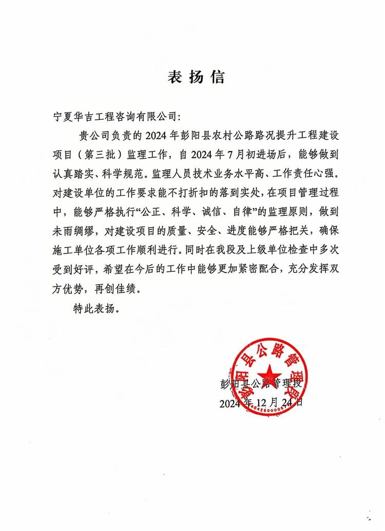 嚴(yán)格監(jiān)理程序,確保農(nóng)村公路提升工程質(zhì)量。在彭陽縣農(nóng)村公路路況提升工程建設(shè)項(xiàng)目中,華吉公司嚴(yán)格按照“公正、科學(xué)、誠信、自律”的原則進(jìn)行監(jiān)理,確保了工程質(zhì)量、安全和進(jìn)度的嚴(yán)格控制,保障了施工單位的工作順利進(jìn)行。該項(xiàng)目在各級檢查中多次獲得好評,體現(xiàn)了華吉公司的專業(yè)水平和責(zé)任感。