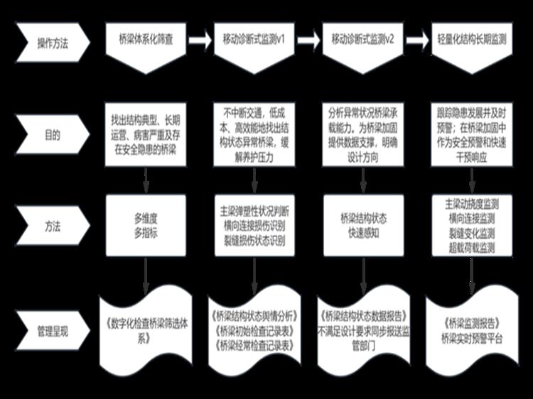 在助力寧夏交通發(fā)展中,寧夏院作為交通運輸行業(yè) “智庫”,結(jié)合相關政策及寧夏普通國省干線橋梁管養(yǎng)現(xiàn)狀,于2024年提出了“一標兩輕”建設理念?!耙粯恕敝傅氖菄栏癜凑铡豆窐蛄航Y(jié)構監(jiān)測技術規(guī)范》建立標準化健康監(jiān)測系統(tǒng);“兩輕”則創(chuàng)新性地融合了基于結(jié)構狀態(tài)快速感知技術的移動診斷式監(jiān)測系統(tǒng)與固定可拆裝式輕量化結(jié)構監(jiān)測系統(tǒng)。在不干擾交通的情況下,借助移動診斷式監(jiān)測系統(tǒng),迅速對橋梁的撓度、殘余變形、振動頻率、荷載橫向分布系數(shù)、裂縫、沖擊系數(shù)、通行荷載數(shù)量及噸位等關鍵指標展開高效移動監(jiān)測。通過對實測數(shù)據(jù)與理論值的細致對比分析,精準定位結(jié)構異常橋梁的關鍵隱患指標,進而運用固定可拆裝式輕量化結(jié)構監(jiān)測系統(tǒng),針對這些隱患指標及相關構件,開展階段性、動態(tài)且精準的監(jiān)測工作,嚴密追蹤隱患指標的發(fā)展態(tài)勢,實現(xiàn)實時預警,并為養(yǎng)護加固工程的實施提供有力指導。憑借橋群內(nèi)“精準循環(huán)”與“以點帶面”的獨特監(jiān)測方式,不僅提高了工作效率,也大大節(jié)省了成本投入。